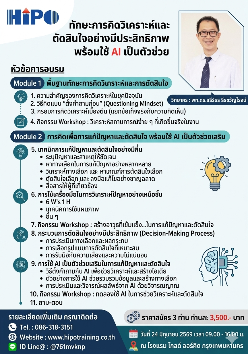 หลักสูตร ทักษะการคิดวิเคราะห์และตัดสินใจอย่างมีประสิทธิภาพ พร้อมใช้ AI เป็นตัวช่วย (อบรม 24 มิ.ย. 69)