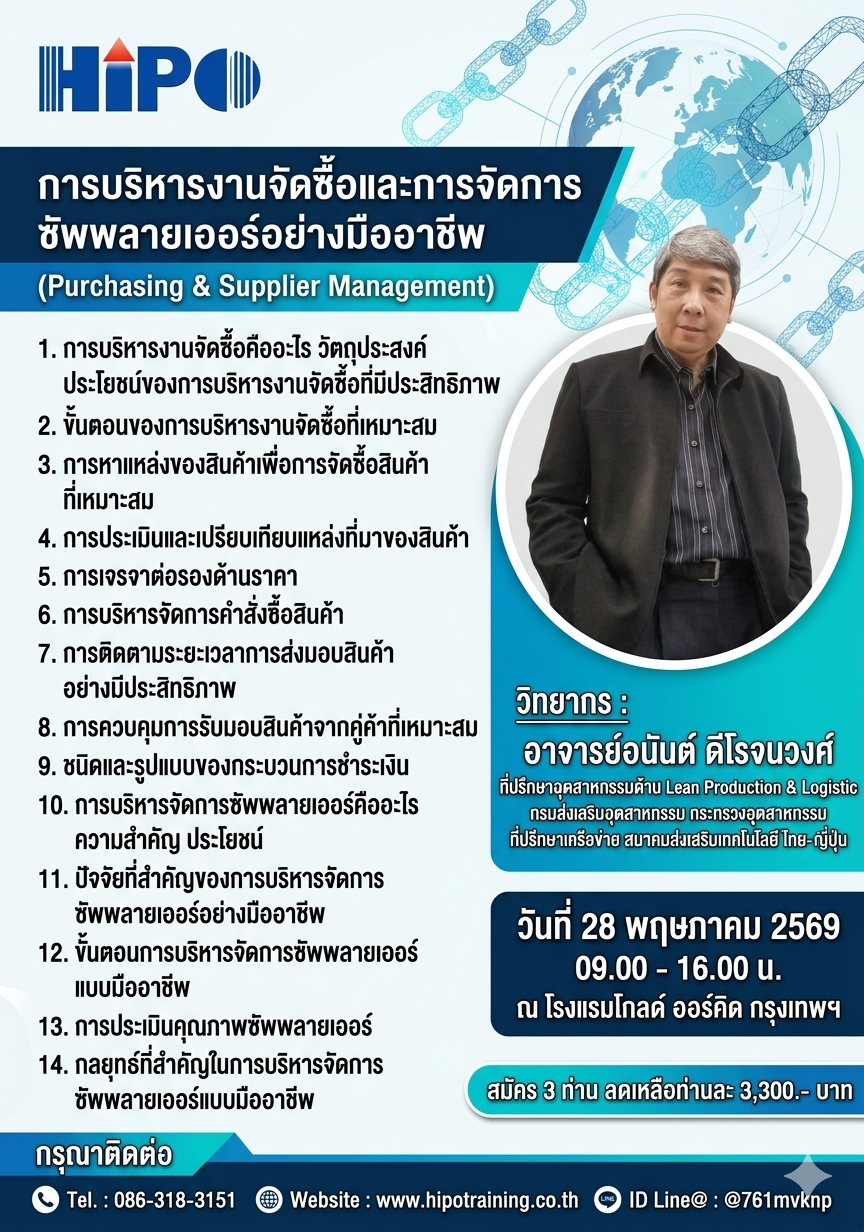 หลักสูตร การบริหารงานจัดซื้อและการจัดการซัพพลายเออร์อย่างมืออาชีพ (อบรม 28 พ.ค. 69)
