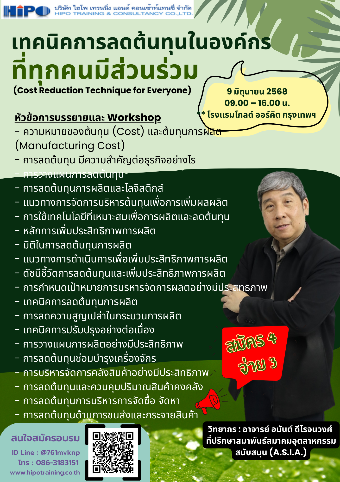 ยืนยันจัดอบรม หลักสูตร เทคนิคการลดต้นทุนในองค์กรที่ทุกคนมีส่วนร่วม (อบรม 9 มิ.ย. 69)